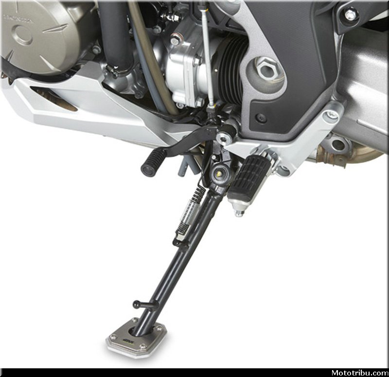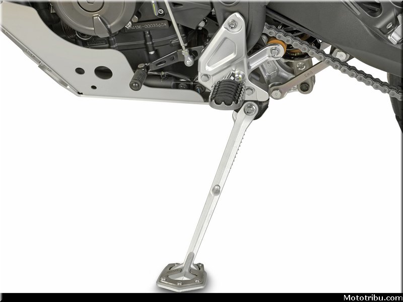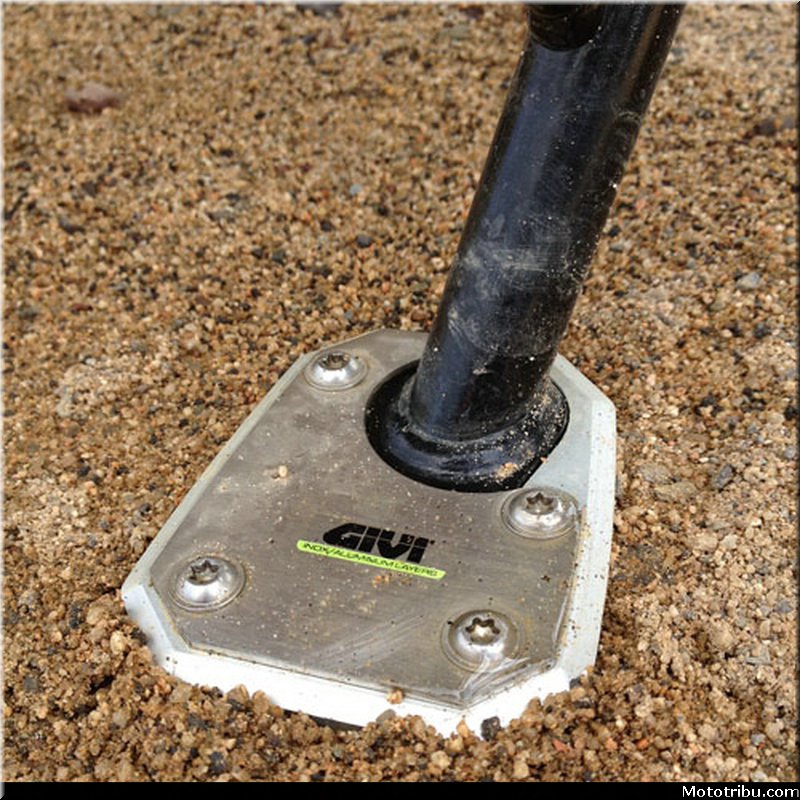 Givi propose une semelle spécifique en aluminium et acier inoxydable pour élargir la surface d’appui de la béquille latérale. Tous les aventuriers le savent, un trail chargé est parfois difficile à stabiliser sur sol meuble. Les béquilles d’origine parfois trop étroites s’enfoncent dans le sol s’il est meuble et tout bascule : la moto avec les bagages les accessoires etc… ce qui peut coûter très cher.