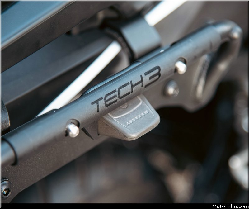 Le premier point de fixation de TECH 3 est le repose-pied du passager, tandis que le cadre supérieur se fixe à la partie supérieure de la moto.