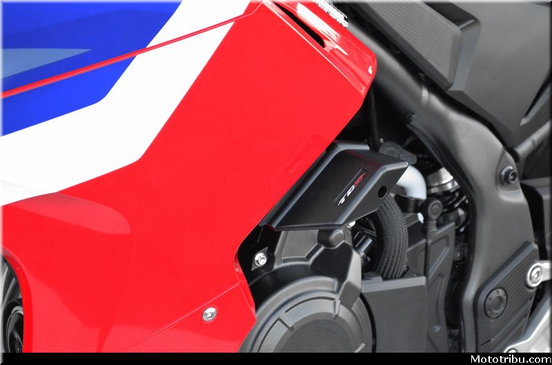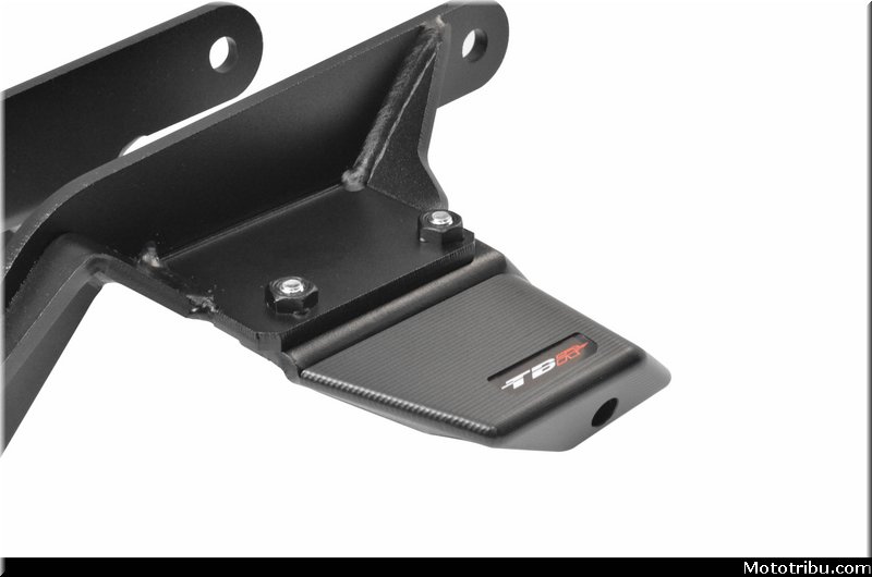 Il présente également l’avantage d’apporter une grande résistance aux chocs et à l’usure tout en favorisant la glisse avec un design épuré et une forme compacte. Ces patins se fixent sur des platines d’acier de 6mm d’épaisseur découpées au laser et pliées avant de recevoir une finition époxy noire. Les platines sont fixées par 2 points de fixation pour une meilleure résistance. L’ensemble platine-patin s’intègre parfaitement sans surcharger la ligne de la petite CBR, tout en apportant une protection efficace.