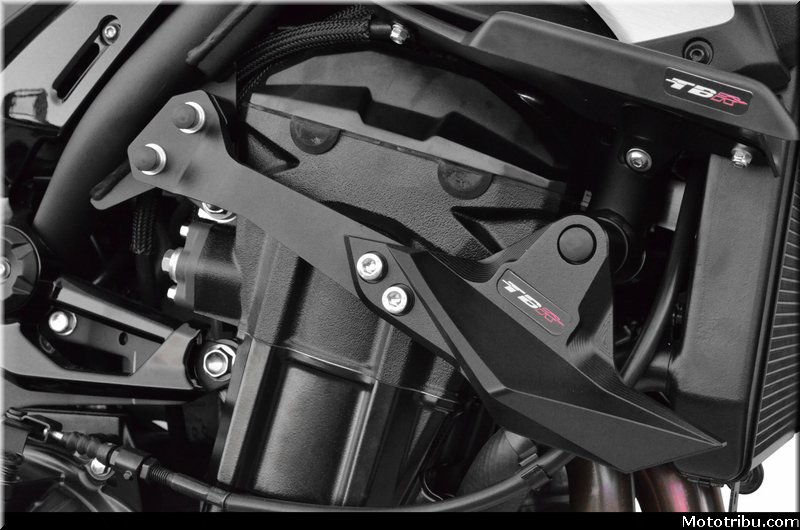Pour accompagner ce kit, Top Block Racing propose également un support de plaque homologué en position haute. La base arrière de la moto se retrouve ainsi épurée ne conservant que de petits clignotants et son feu arrière. Au registre des équipements que l’on pourrait qualifier d’indispensables dès lors que l’on roule sur route en roadster il y a aussi les crash-pads, pour venir sécuriser le moteur et le cadre.