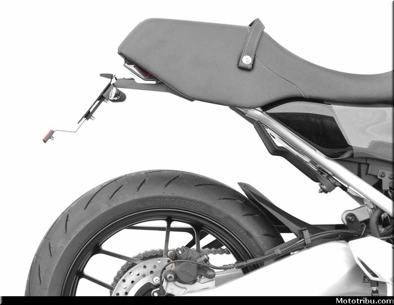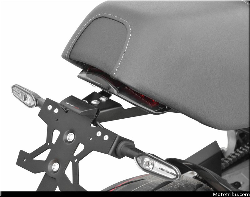 Ce support permet ainsi à la base arrière de la moto de se retrouver plus épurée grâce à l’intégration d’un nouveau feu arrière TBR, de petits clignotants, ainsi que de nouveaux clignotants LED et d’un feu stop/feu de position fumé homologué inclus.