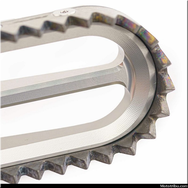La base du repose-pied est usinée dans un aluminium aéronautique 6061-T6, avant d’être anodisée pour une résistance accrue à l’usure. Les dents sont quant à elles réalisées en titane Ti-6AL-4V de qualité aérospatiale. Remplaçables, elles offrent une longévité optimale, tout en réduisant considérablement l’usure des bottes grâce à leur profil plus épais que les versions en acier classiques.