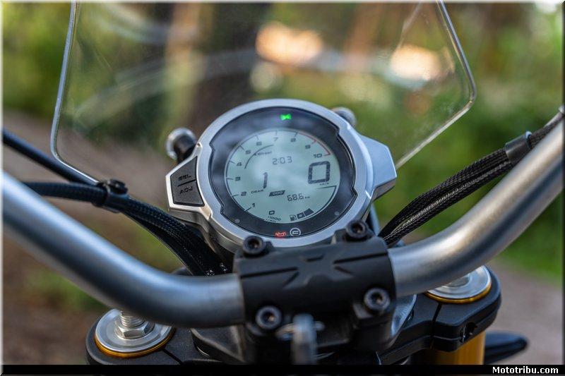 De l’instrumentation « light » (en apparence seulement car les informations sont ultra complètes) illustrée par le simple compteur rond, au guidon relevé, en passant par le garde-boue haut tout-terrain, tout respire la polyvalence et invite à la découverte des chemins.