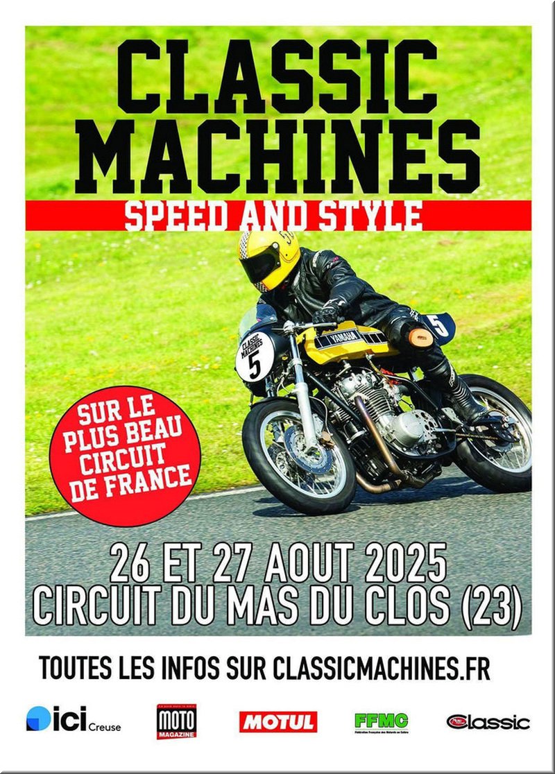 En 2025 Classic Machines crée la surprise en s’invitant sur le superbe circuit du Mas du Clos, les 26 et 27 août ! Le Mas du Clos ? Certains disent que c’est le plus beau circuit de France ! Imaginez un espace naturel, comme un énorme terrain de golf au cœur de la forêt creusoise, à une heure de Clermont Ferrand. Et dans cet écrin, un ruban de bitume noir de trois kilomètres et trois cent mètres de dénivelé.
