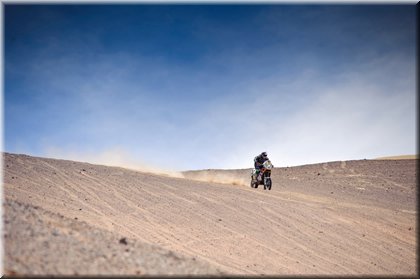 Mais sur le final, malgré la douleur imposée par un amortisseur fracassé sur un choc, Cyril Despres rejoint l’arrivée avec le meilleur temps du jour.