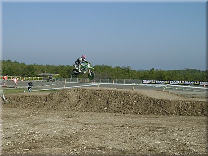 | Deuxième départ et chute collective au premier virage. Laurent Prieri évite les 4 pilotes à terre en passant largement à l'extérieur... hors du circuit, mais une fois de plus l'intervention des secours oblige un arrêt de la course... |