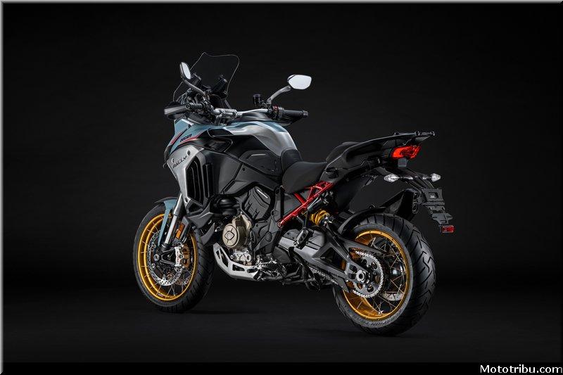 La nouvelle Ducati Multistrada V4 Rally est disponible en trois niveaux de finition différents : Radar, équipé d’un régulateur de vitesse adaptatif, d’une détection d’angle mort et d’un avertissement de collision avant ; Adventure Travel & Radar, qui ajoute des valises latérales en aluminium et des selles passagers et pilotes chauffants ; et Full Adventure, qui complète cet ensemble avec un silencieux Akrapovic homologué pour la route et un garde-boue avant en fibre de carbone
