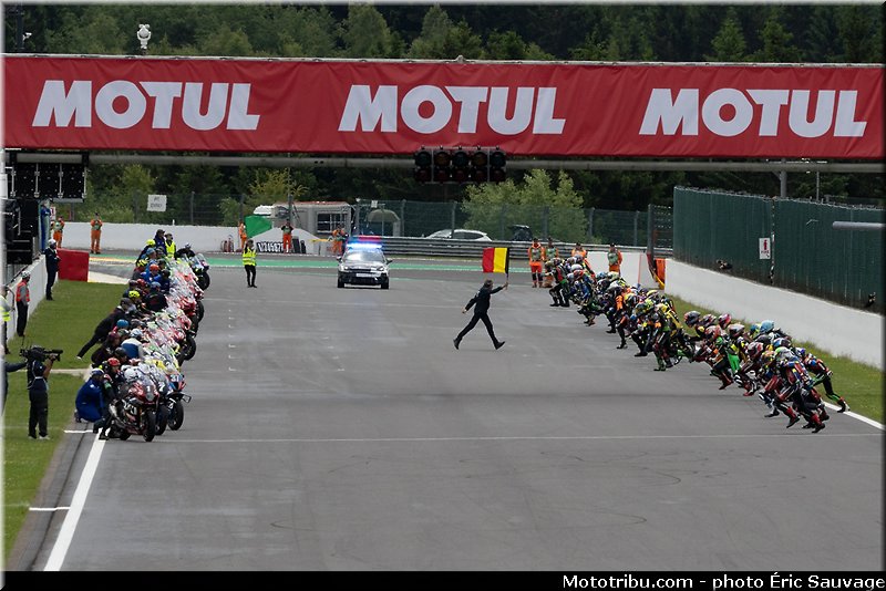 Rien de trop perturbant puisque ce n’est que quelques gouttes fines et surtout que cela ne dure pas. Mais le ciel est toujours très chargé en nuages même si le soleil tente une apparition durant la procédure de départ. Alors pneus slick ou pneus pluie? Certains teams se posent toujours la question et les mécanos très sportifs courent au box et reviennent sur la piste avec d’autres pneus.