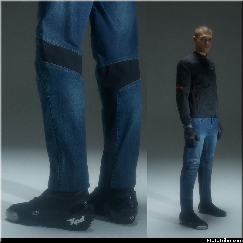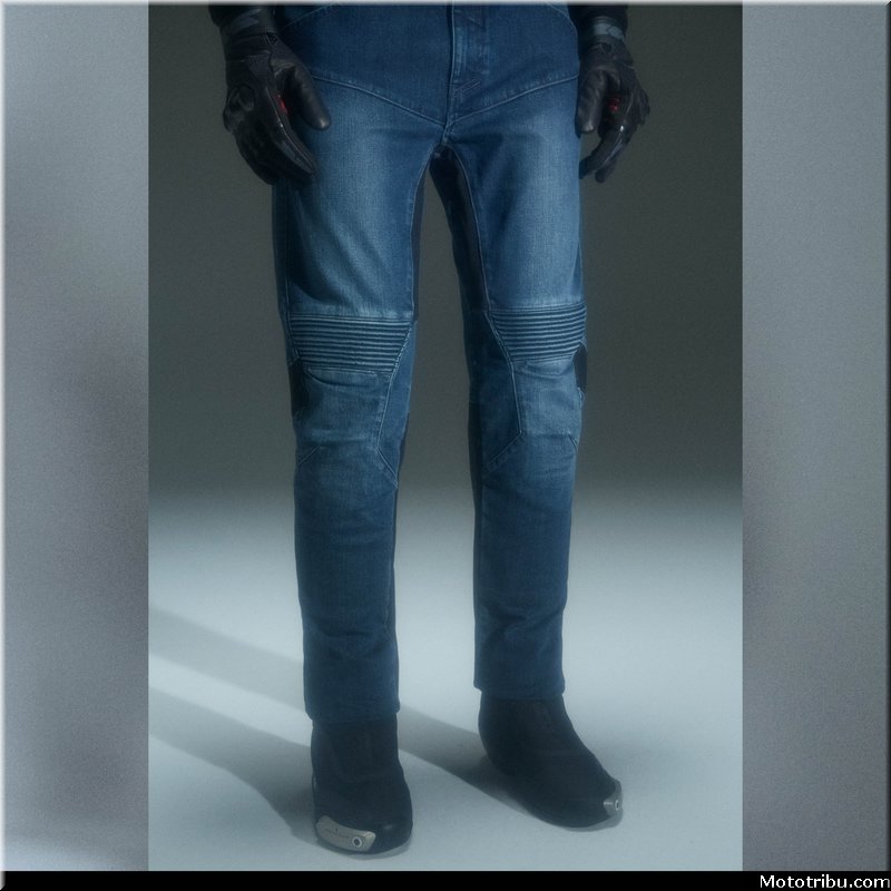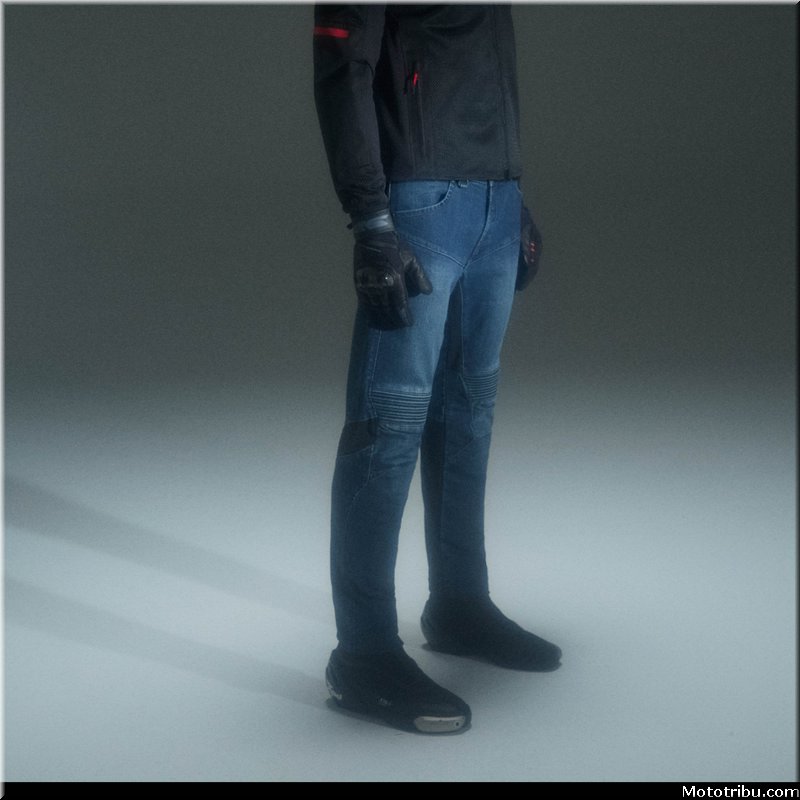 Il adopte en revanche de nouveaux empiècements depuis l’arrière du genou jusqu’au bas du pantalon, pour une plus grande liberté de mouvements et un confort optimal en position de conduite. Les genoux préformés associés aux empiècements en denim extensibles au-dessus des genoux participent à une meilleure ergonomie et plus de confort.