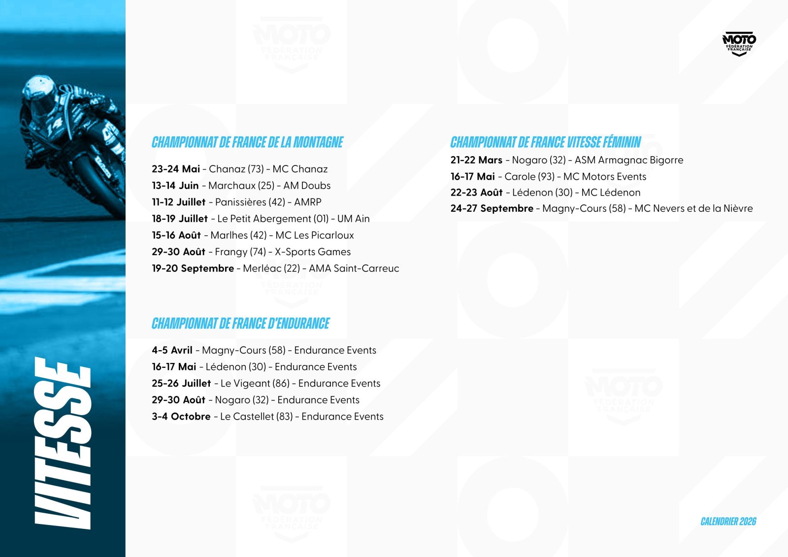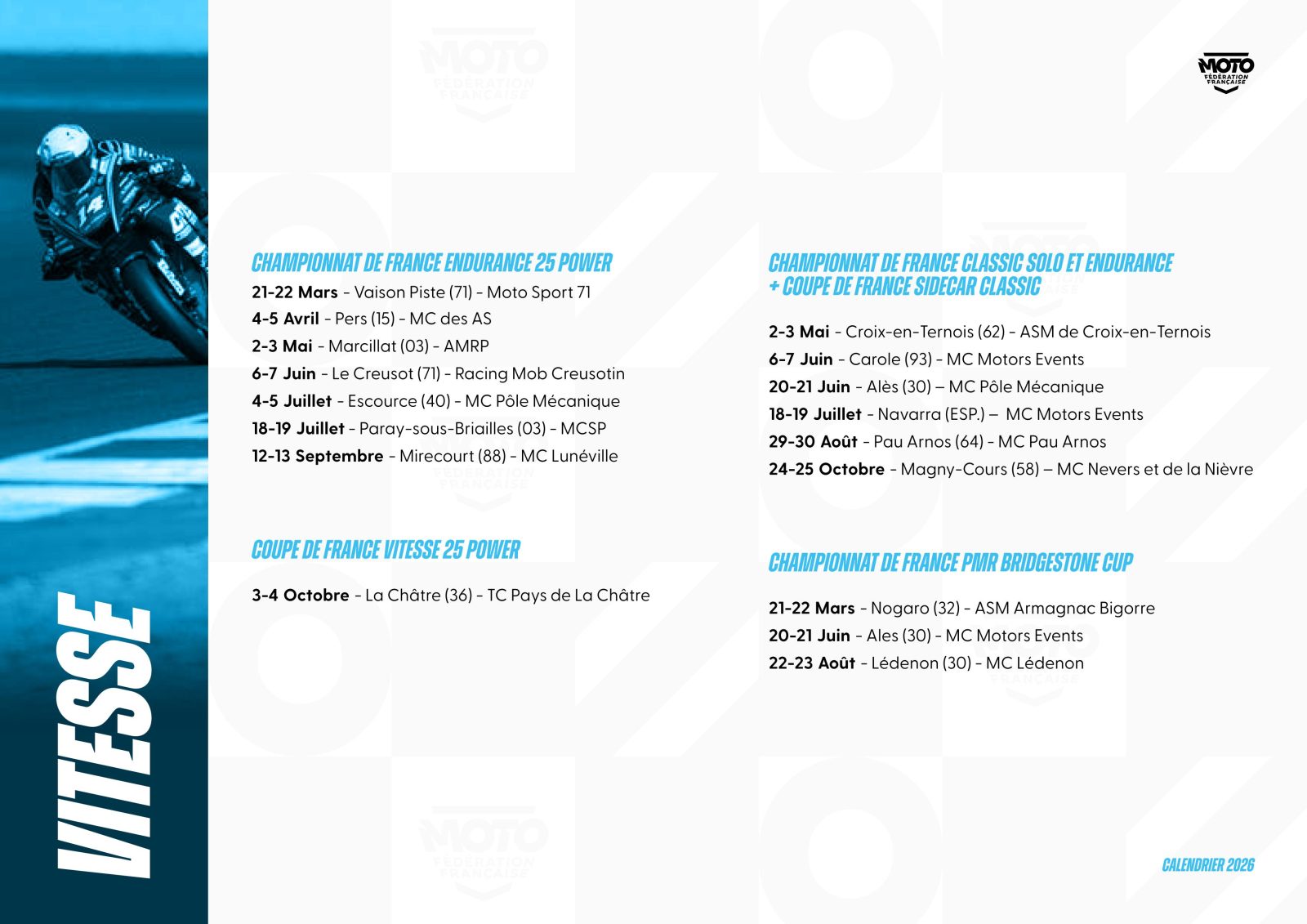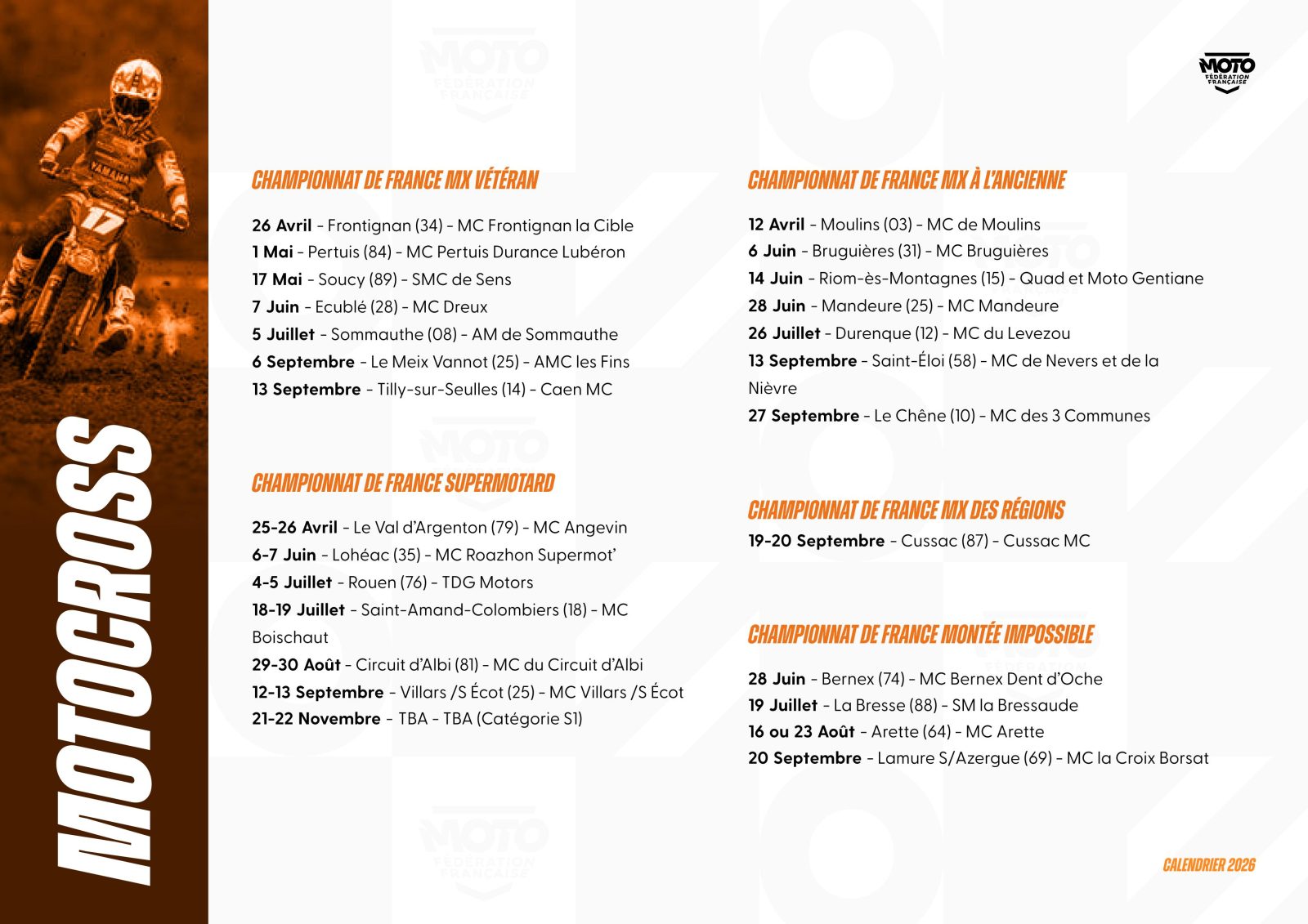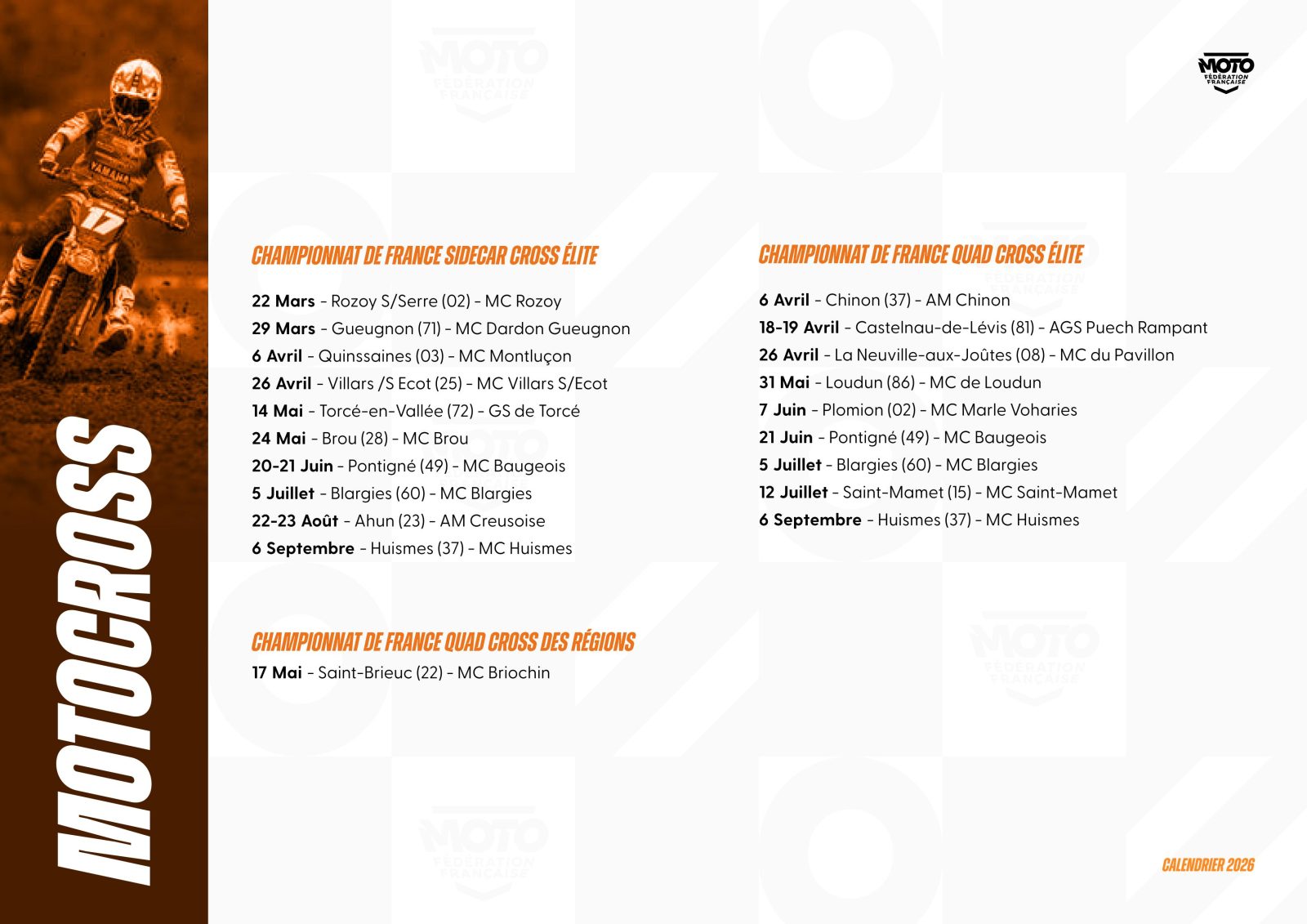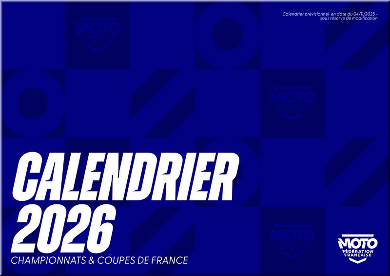 La Fédération Française de Motocyclisme a le plaisir de lever le voile sur le calendrier prévisionnel* des Championnats et Coupes de France 2026. Une saison qui s’annonce des plus riches pour l’ensemble des disciplines et pour lesquelles nos Moto-Clubs organisateurs seront pleinement investis pour permettre aux pilotes de vivre intensément leur passion. Ce calendrier sera complété des disciplines, Championnats et Coupes de France manquants dans les meilleurs délais.