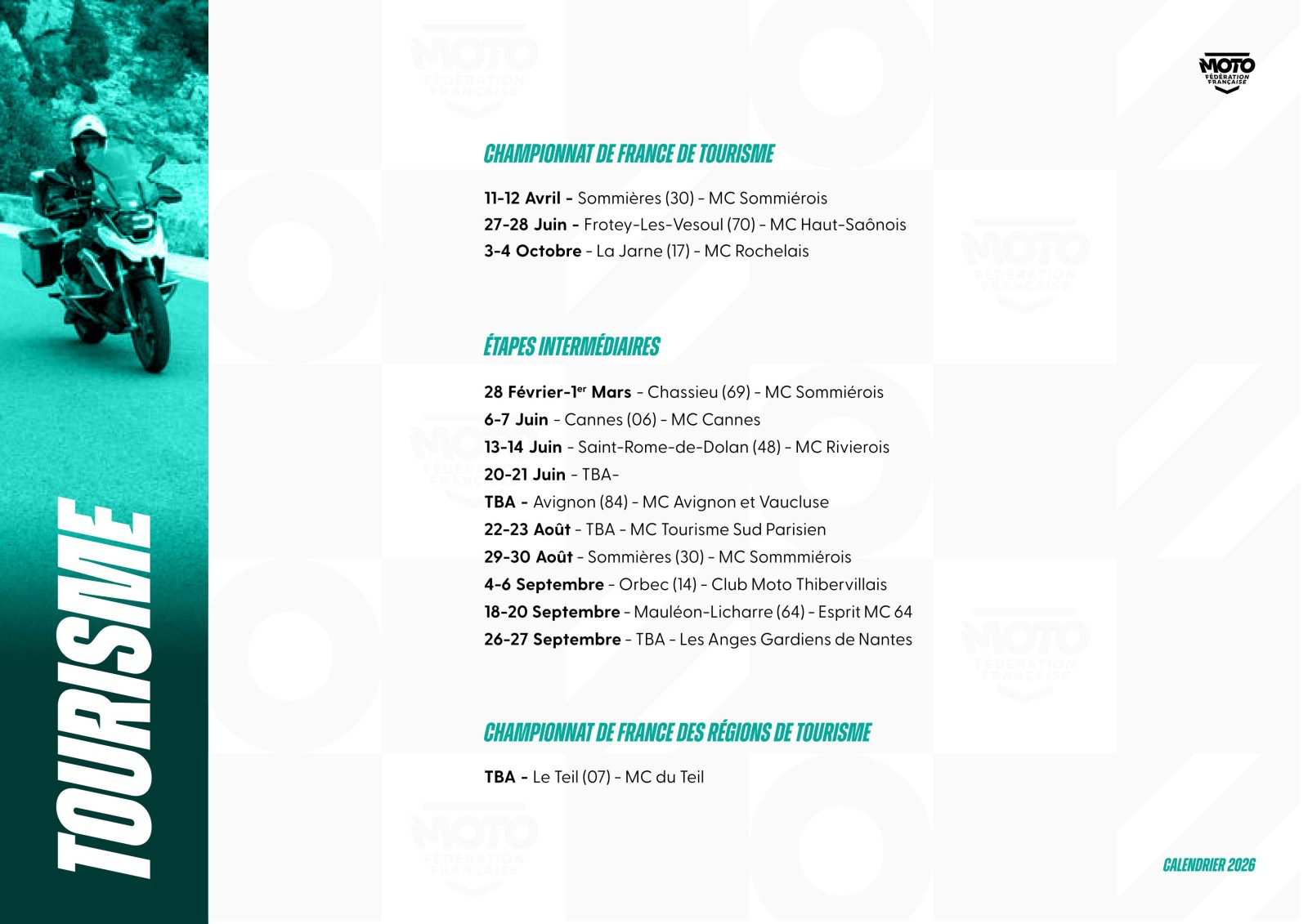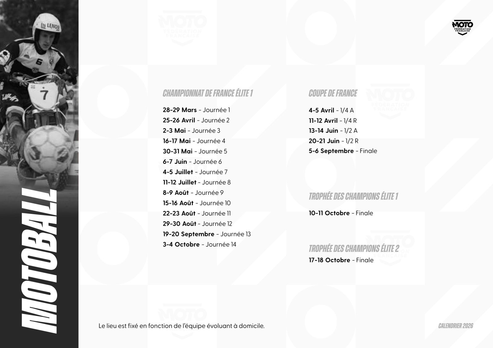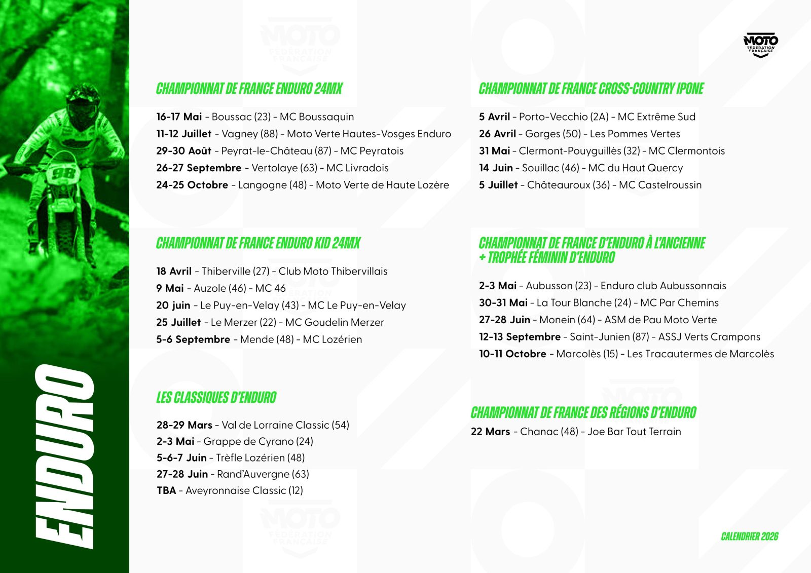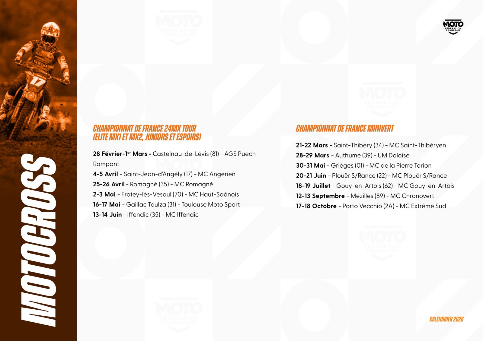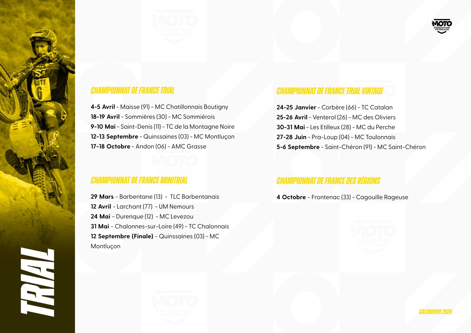 La Fédération Française de Motocyclisme a le plaisir de lever le voile sur le calendrier prévisionnel* des Championnats et Coupes de France 2026. Une saison qui s’annonce des plus riches pour l’ensemble des disciplines et pour lesquelles nos Moto-Clubs organisateurs seront pleinement investis pour permettre aux pilotes de vivre intensément leur passion. Ce calendrier sera complété des disciplines, Championnats et Coupes de France manquants dans les meilleurs délais.