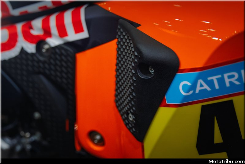 Le poste de pilotage, où les pilotes passent des centaines d’heures, a été optimisé dans les moindres détails pendant plus de dix ans. Une bulle spécialement conçue améliore l’aérodynamisme en réduisant les turbulences et la fatigue du pilote. Elle s’intègre parfaitement à la tour de navigation en fibre de carbone, conçue pour accueillir le tableau de bord KTM avec voyants intégrés et fixations pour le système roadbook numérique.