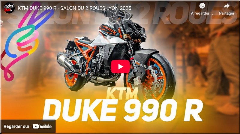 Les présentations vidéo Motorlive de la KTM 990 Duke R 2025 au Salon de Milan et de Lyon.