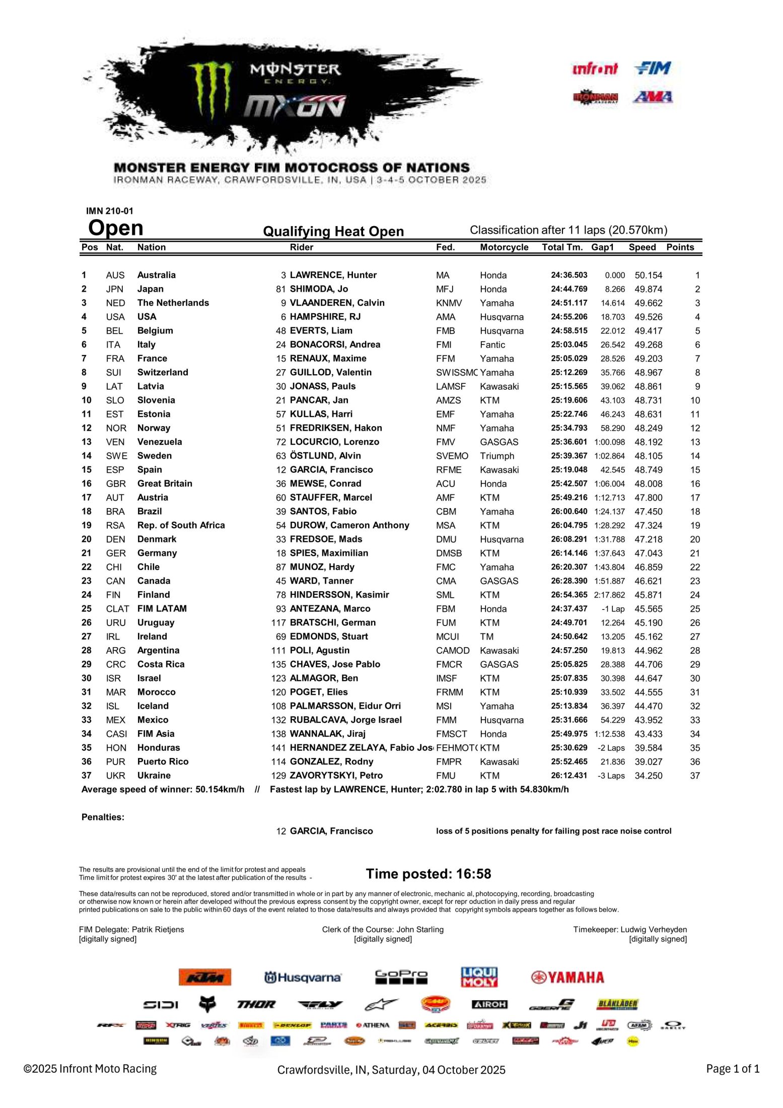 Les qualifications du Motocross des Nations ont rendu leurs verdicts dans les 3 catégories MXGP, MX2 et Open. La domination de l’Australie et des frères Lawrence a été totale avec une victoire de Jett en MXGP et de Hunter en Open. Si l’on pense que Kyle Webster fait 5 en MX2 on pourrait considérer que l’affaire est pliée mais… ce ne sont que les qualifications. Les résultats des tricolores sont assez équilibrés avec une 3ème place pour le champion du monde Romain Febvre en MXGP, une 8ème pour Mathis Valin en MX2 et une 7ème pour Maxime Renaux en Open. La France peut envisager le podium.