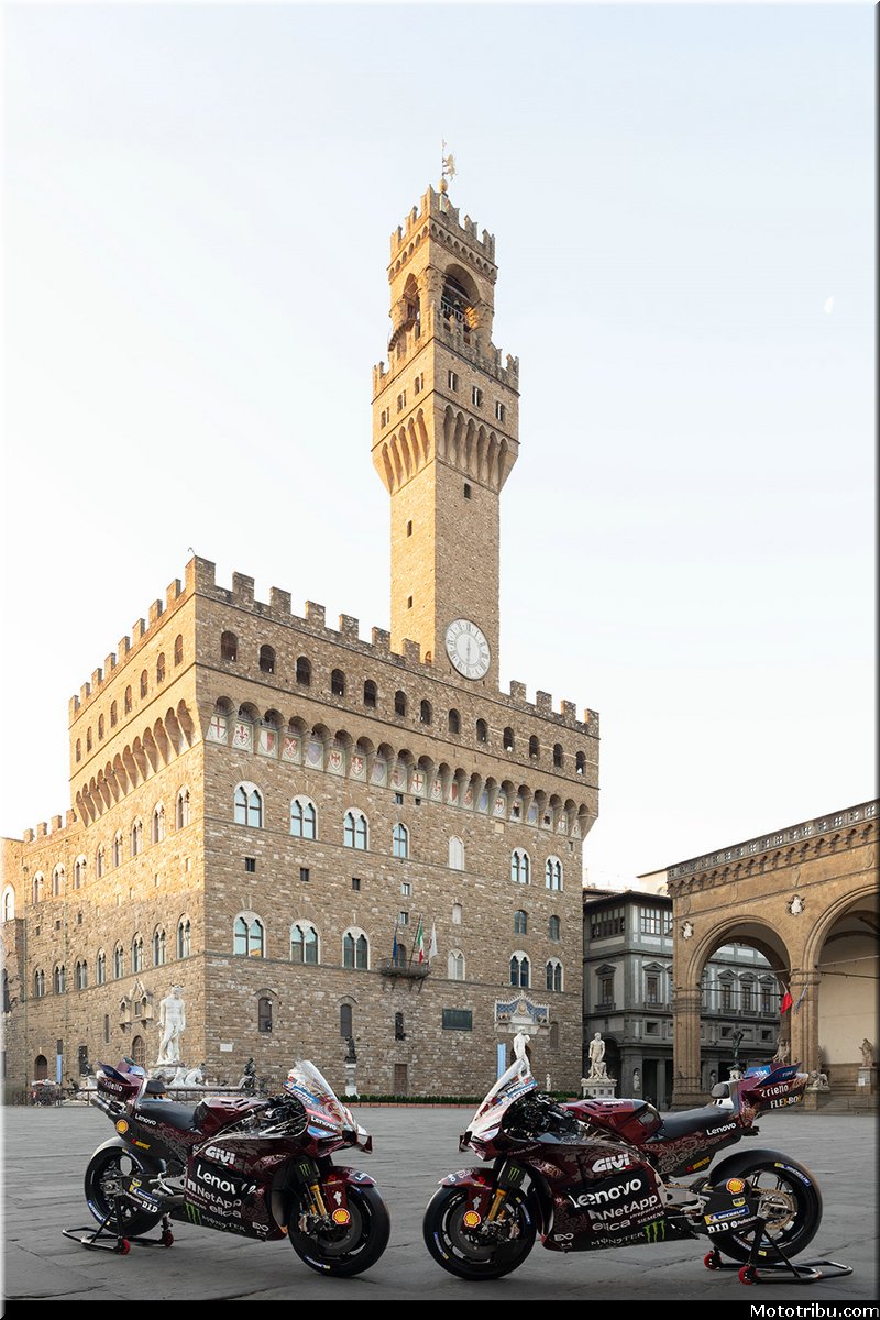 Les Desmosedici GP conquièrent la majesté de la Piazza della Signoria avec élégance et respect, se comparant aux extraordinaires œuvres d’art et d’architecture qui les entourent, sous l’ombre imposante du David de Michel-Ange et la façade solennelle du Palazzo Vecchio.
