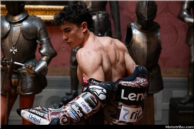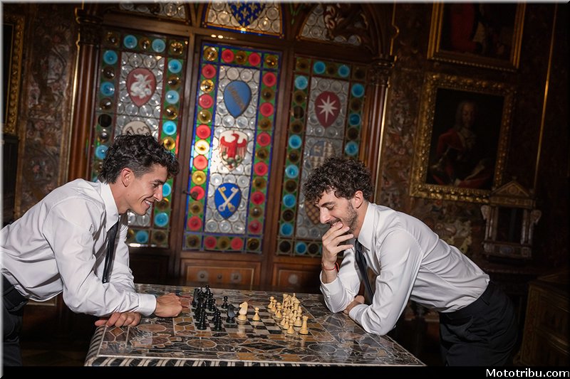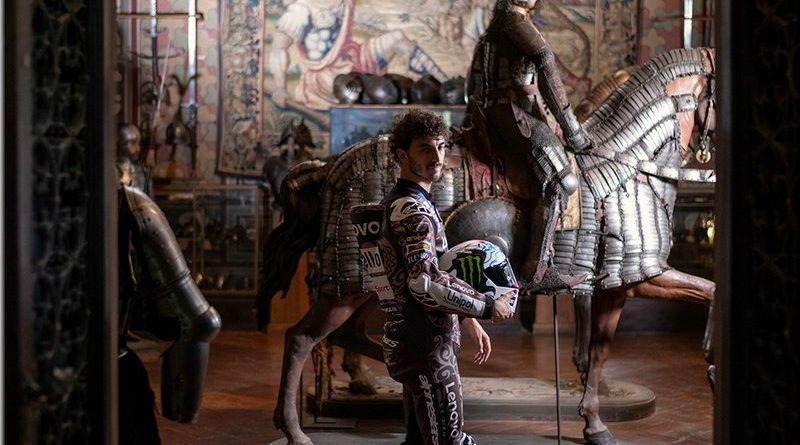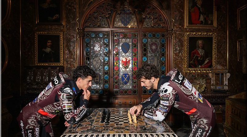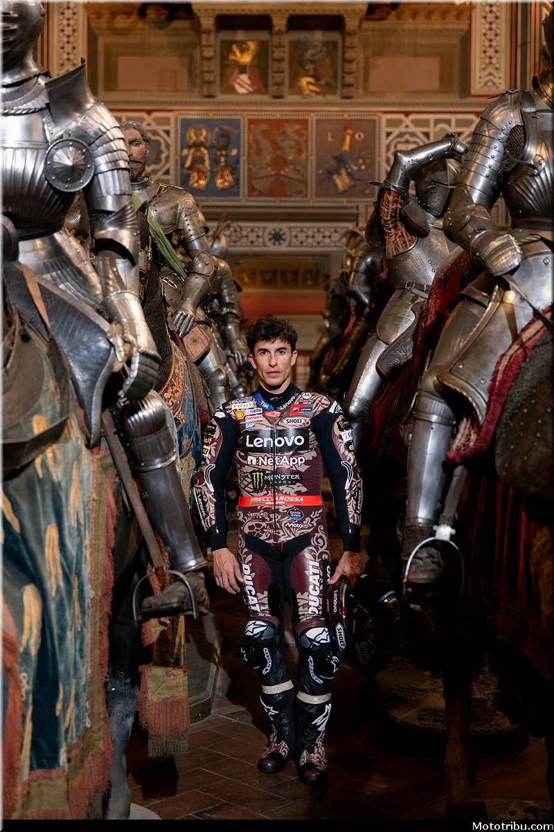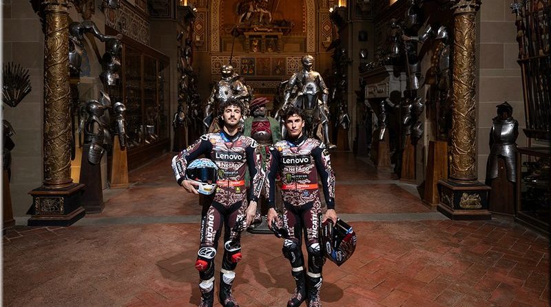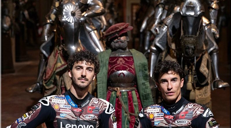 Le résultat d’une collaboration entre le designer Aldo Drudi et l’historien Marcello Simonetta, le projet réinterprète les pilotes Bagnaia et Márquez en chevaliers des temps modernes, avec les Desmosedici GP représentant leurs destriers contemporains
