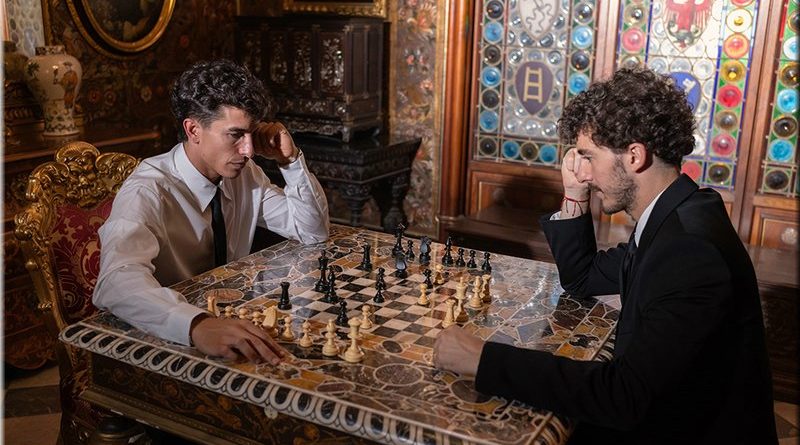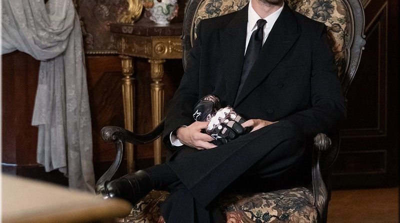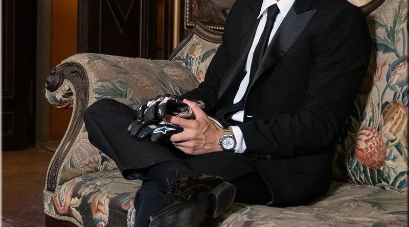 Entourés d’armures qui semblent prendre vie, ils portent des casques, des cuirasses et des gants, réinterprétés dans une clé contemporaine : casque, costume et gants de course, inspirés des motifs de la livrée spéciale.