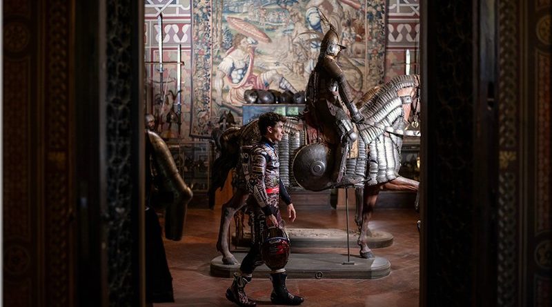 Dans le musée Stibbert, temple de la collection de la Renaissance, les pilotes du Ducati Lenovo Team entrent habillés en gentlemen et se transforment en chevaliers modernes.