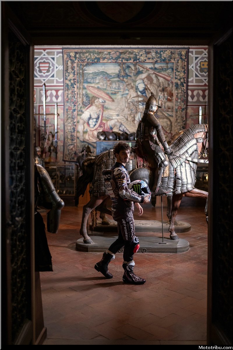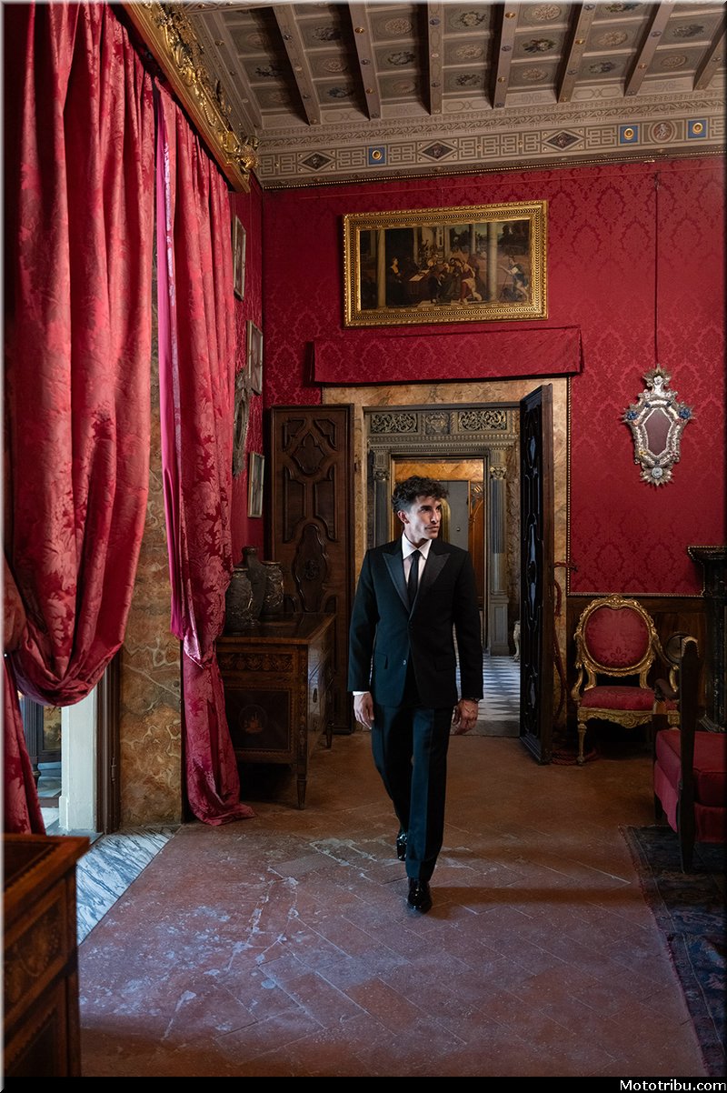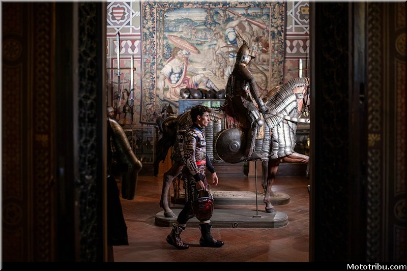 Dans le musée Stibbert, temple de la collection de la Renaissance, les pilotes du Ducati Lenovo Team entrent habillés en gentlemen et se transforment en chevaliers modernes.