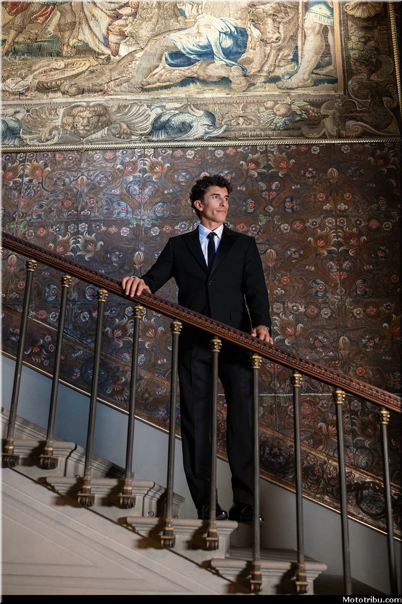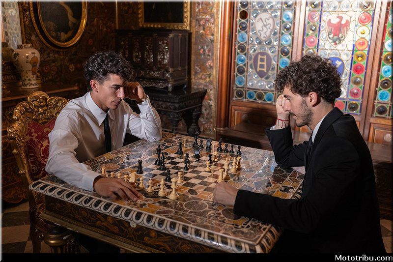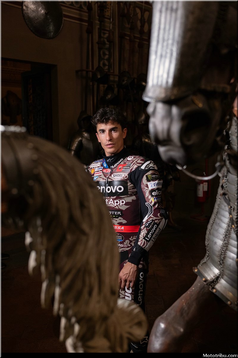 Le résultat d’une collaboration entre le designer Aldo Drudi et l’historien Marcello Simonetta, le projet réinterprète les pilotes Bagnaia et Márquez en chevaliers des temps modernes, avec les Desmosedici GP représentant leurs destriers contemporains