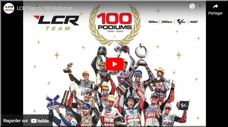 La vidéo des 100 podiums décrochés par le team LCR et la liste des pilotes qui sont montés sur les 3 premières marches des Grand Prix de la catégorie reine au fil des années depuis Nobby Ueda en 1998 en Malaisie jusqu’à Alex Rins au Texas en 2023 en passant par Randy De Puniet second au nombre de podium avec 18 trophées juste derrière le boss lui-même Lucio Cecchinello qui en a totalisé 19.
