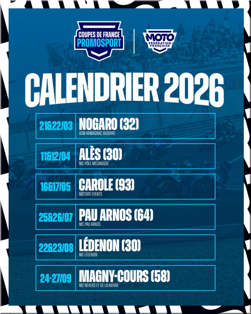 FFM Promosport Promosport 2026 Sport Sport Vitesse Vitesse France Vitesse France 2026 PROMOSPORT – le calendrier 2026 29 novembre 202529 novembre 2025 Adrien 5515 Vues Le calendrier 2026 des Coupes de France Promosport. Abonnez-vous à la newsletter Mototribu Veuillez laisser ce champ vide Merci pour votre abonnement