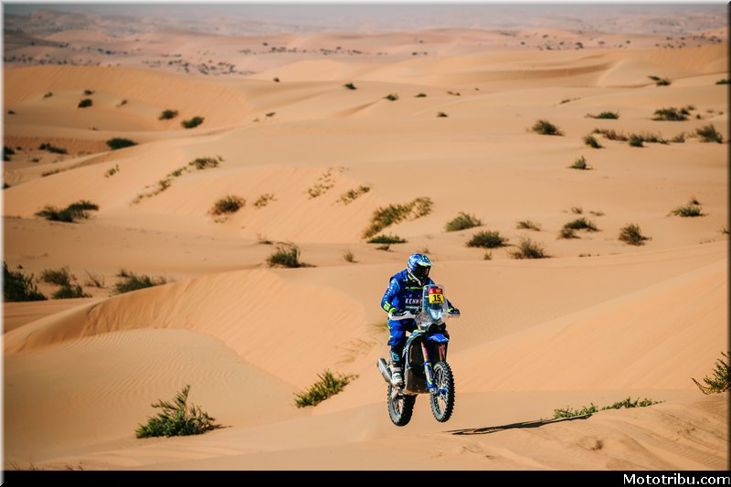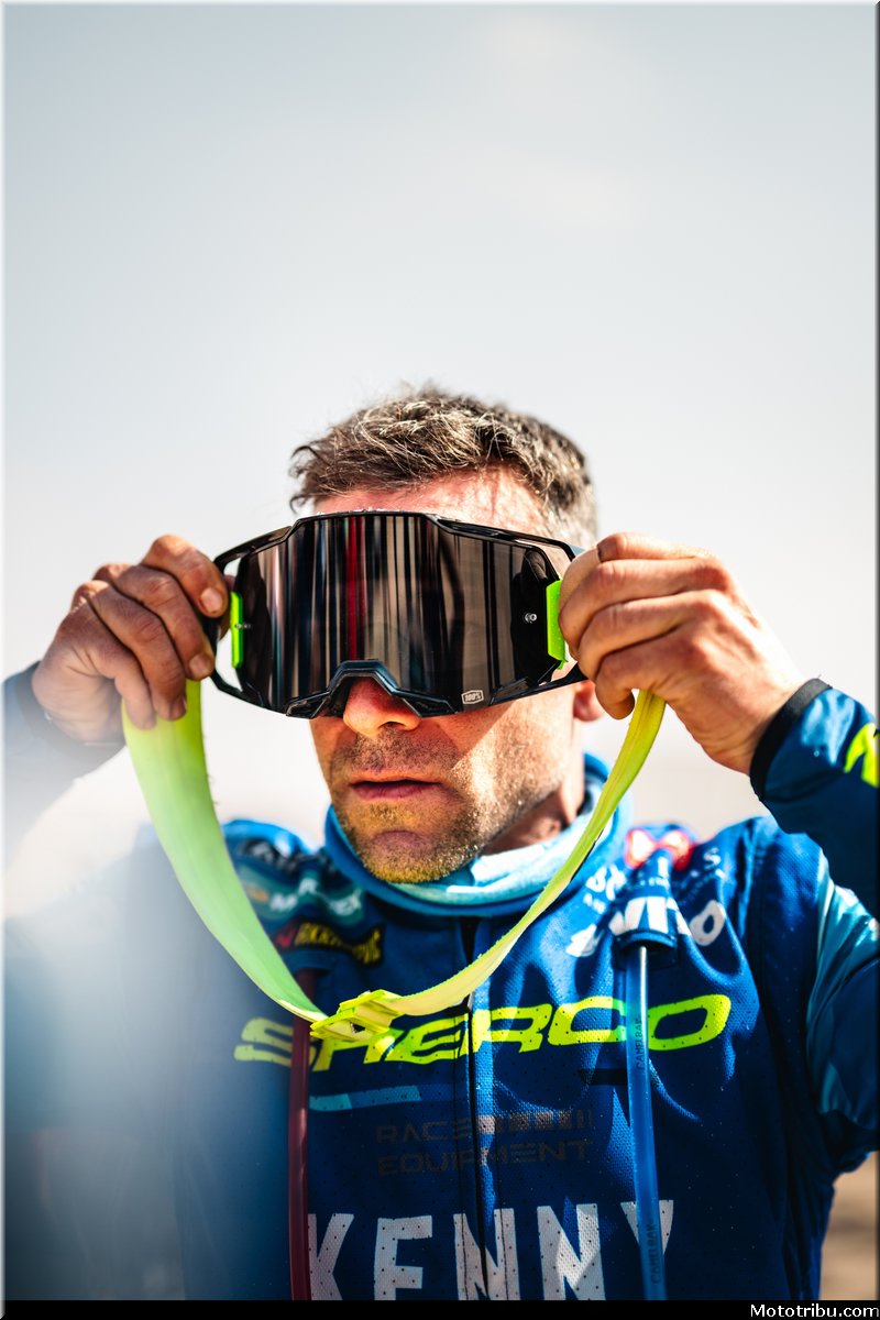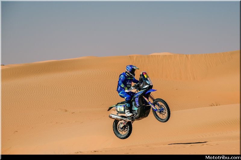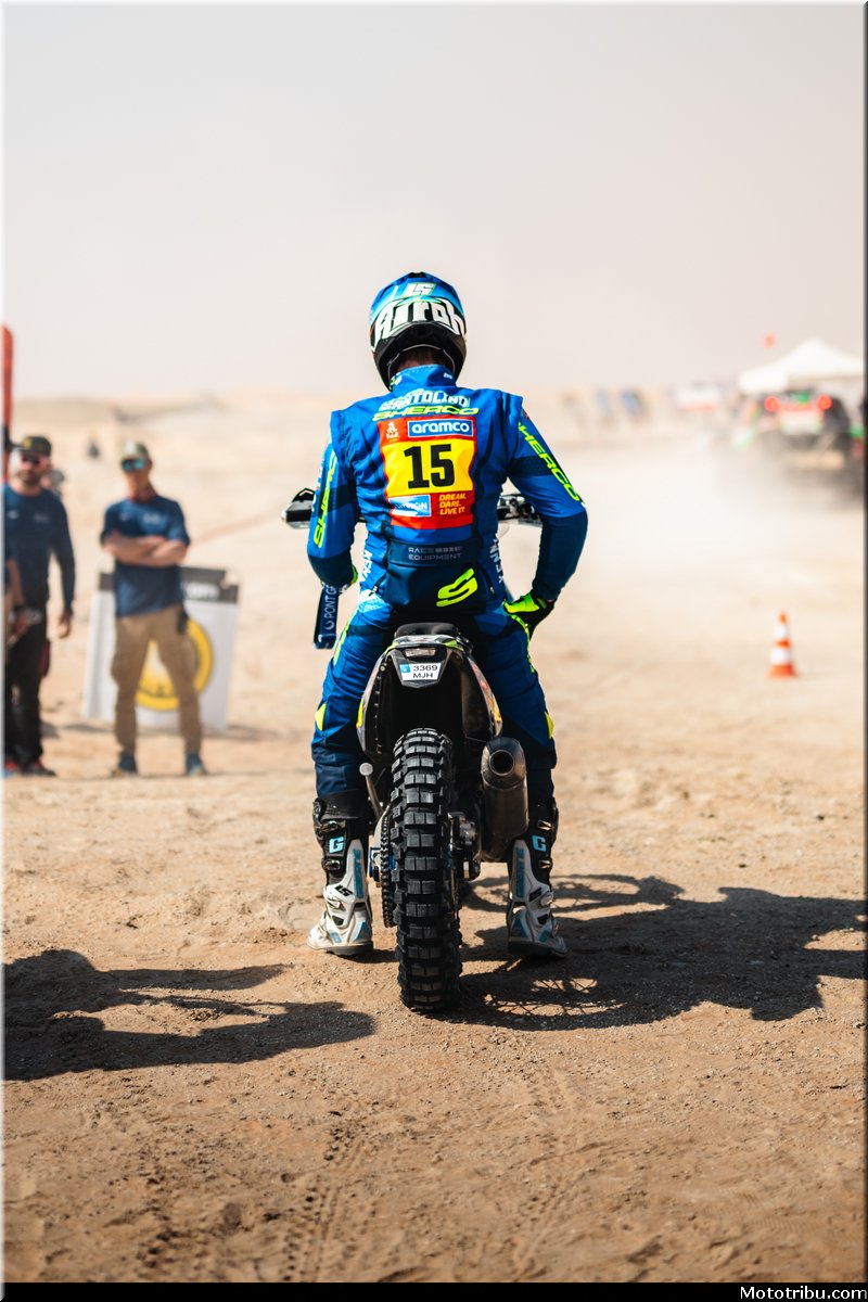 « Aujourd’hui, nous avons affronté une étape de 125 kilomètres pleine de dunes où je me sentais super bien dès le départ. La navigation était parfaite, et je roulais confortablement, profitant du défi. Tout se passait parfaitement, jusqu’à ce qu’à seulement 300 mètres de l’arrivée, à deux minutes de la franchir, ma moto tombe en panne d’essence à cause d’une fissure dans l’un des réservoirs.