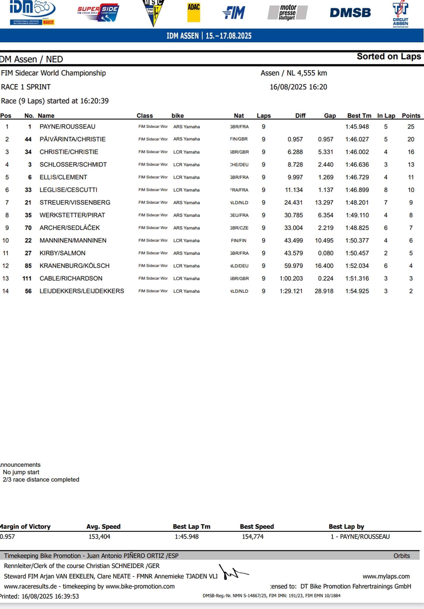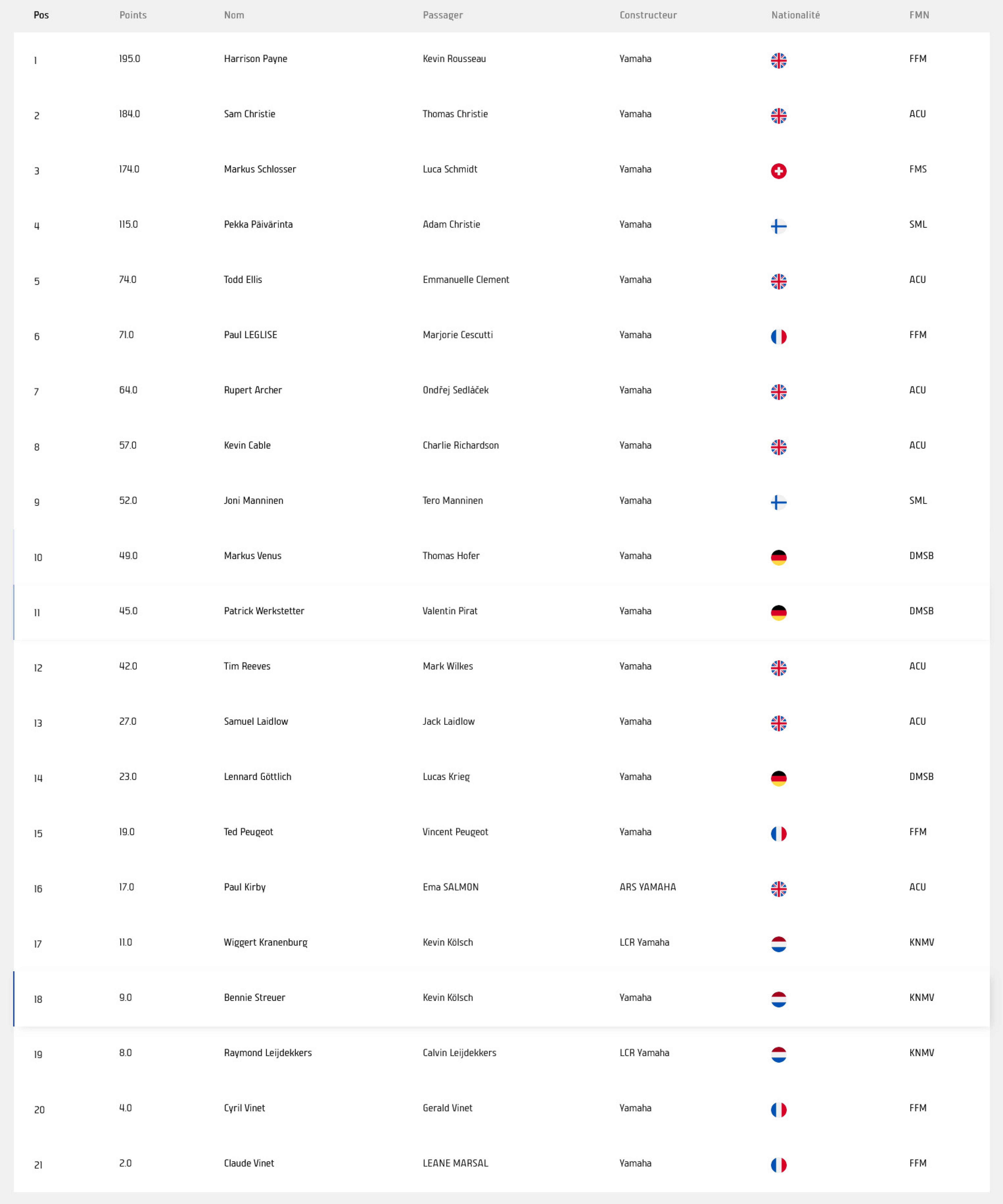 Sous le drapeau à damier, à peine plus d’une seconde séparait le premier du quatrième. Payne/Rousseau se sont imposés devant les frères Christie, Päivärinta/Christie et Schlosser/Schmidt, tandis qu’Ellis/Clement franchissaient la ligne loin derrière, en cinquième position, devant le pilote britannique Rupert Archer (ARS Yamaha) et son passager tchèque Ondřej Sedláček.