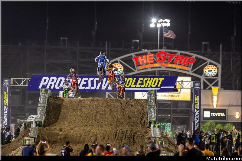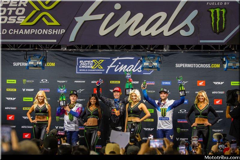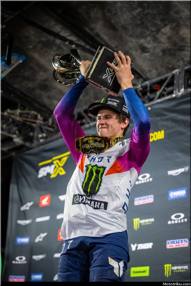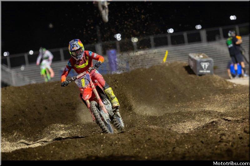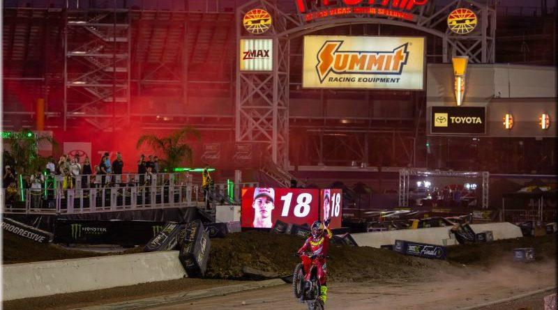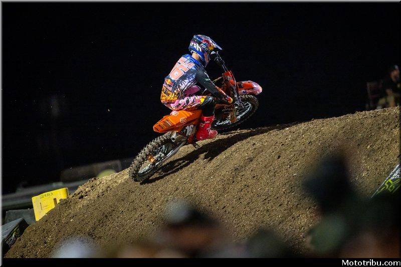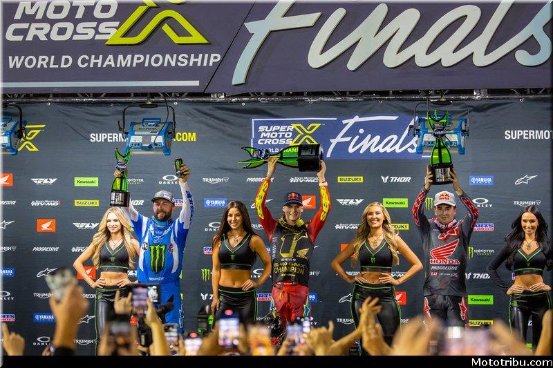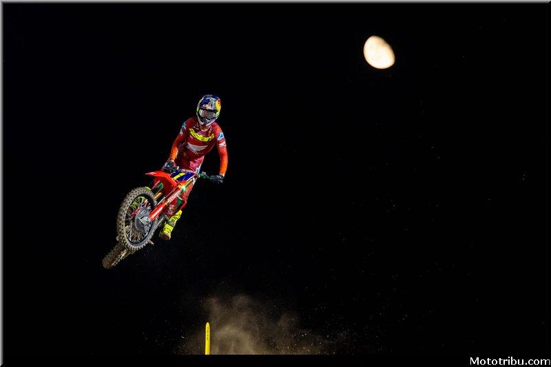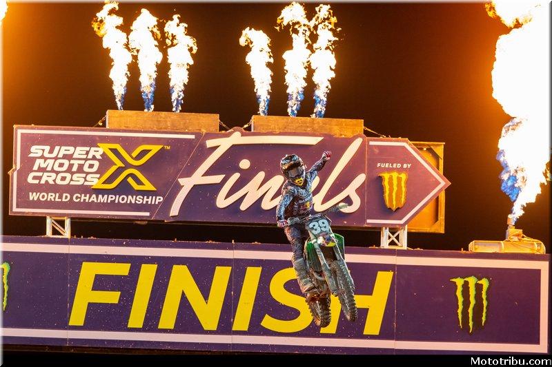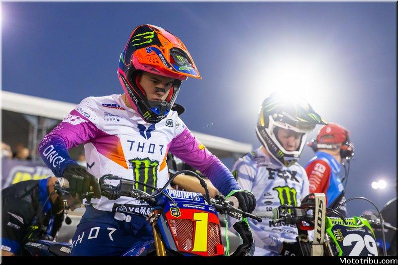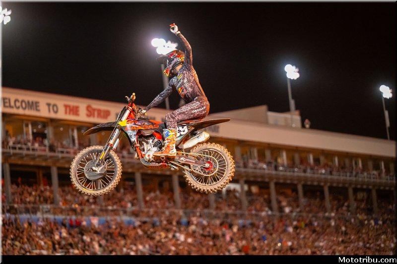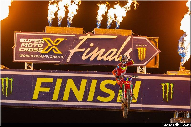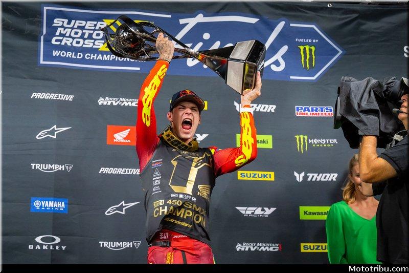 450 – Clap de fin sur la saison de cross US avec cette finale de Las Vegas qui vient décerner une sorte de titre de champions des champions, histoire de faire un peu d’ombre au WSX mondial. C’est donc Jett Lawrence qui s’est imposé confirmant sa bonne condition physique après son abandon de la saison outdoor et sa première victoire lors des playoff de Charlotte. Jett empoche la coquette somme d’1 million de dollars. Son frère Hunter second se contentera de 500 000 et Eli Tomac 3ème de 250 000. De quoi partir en vacance serein pour les trois hommes. Chase Sexton éreinté par sa saison et son titre outdoor a préféré jeter l’éponge dès le début de la première manche. Dylan Ferrandis se classe 13ème.