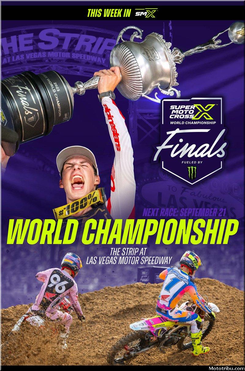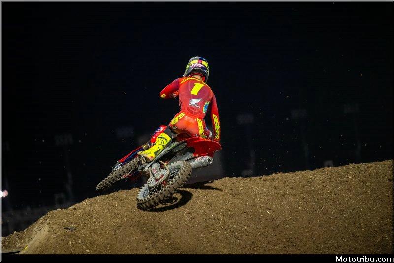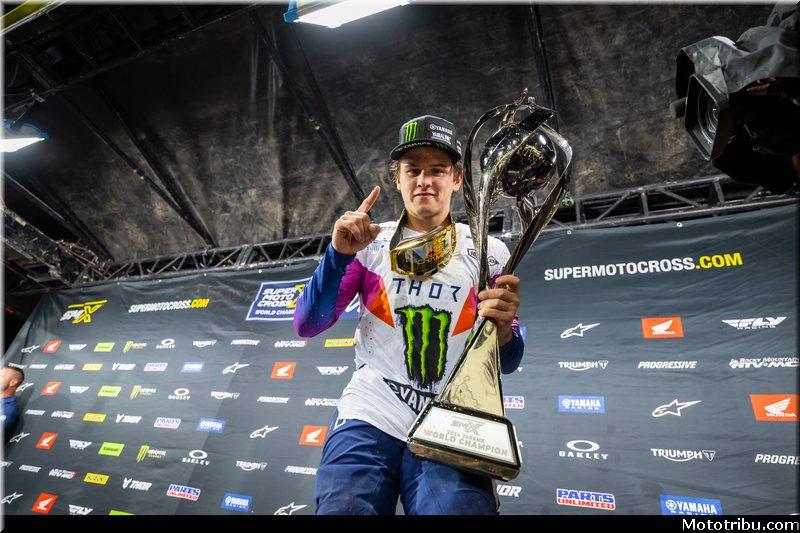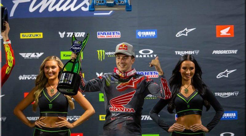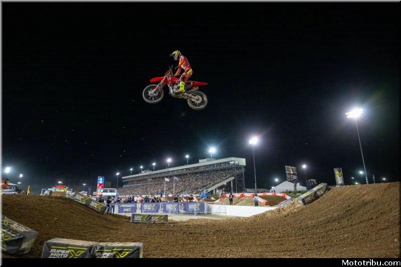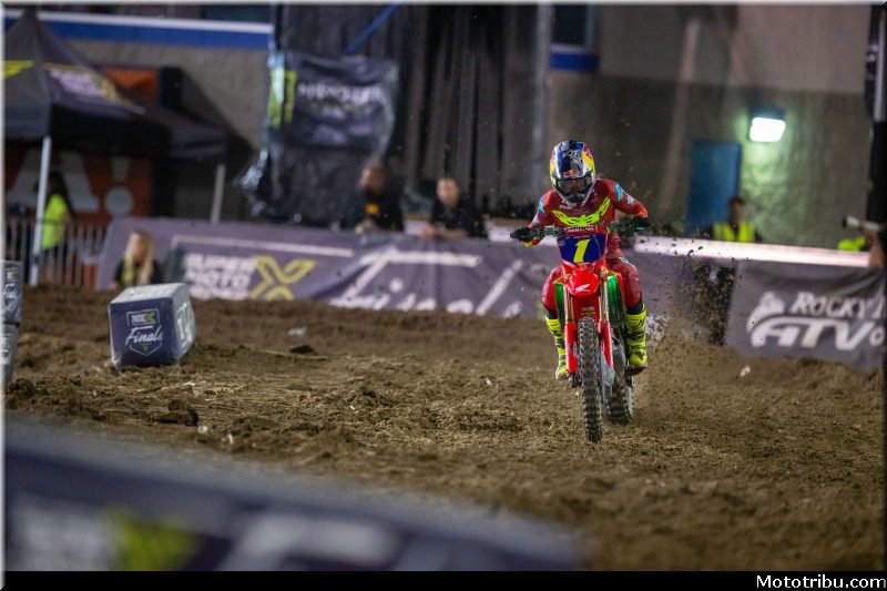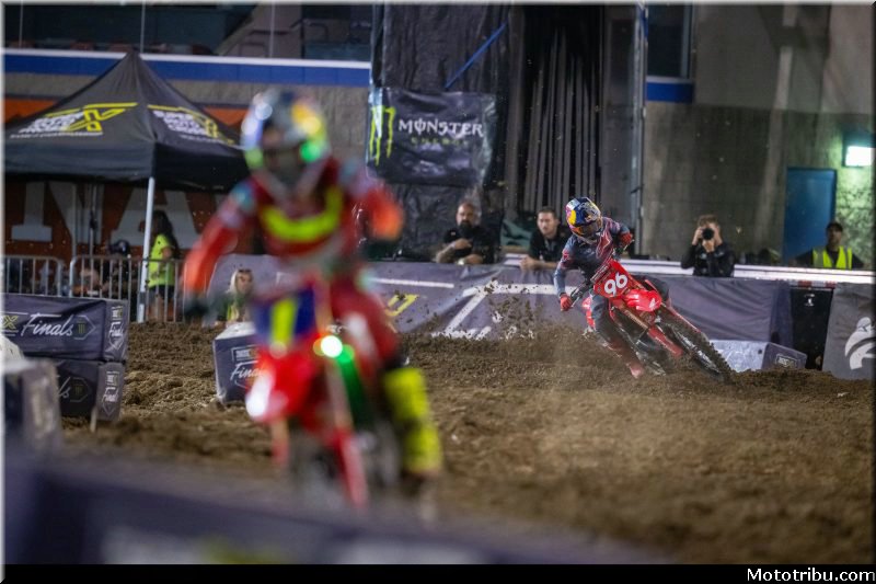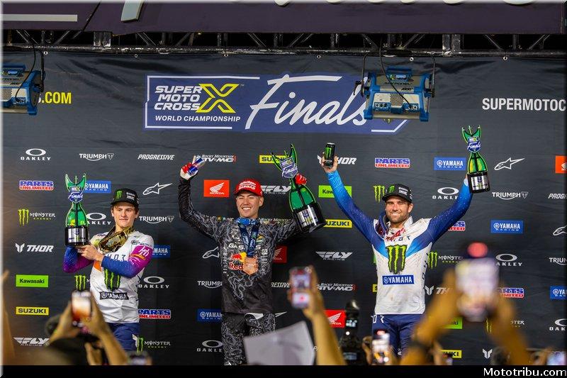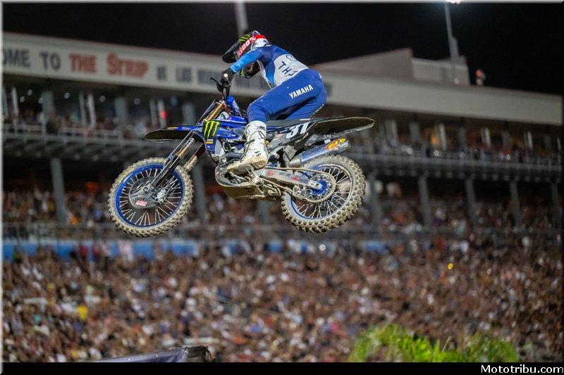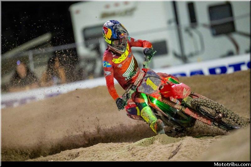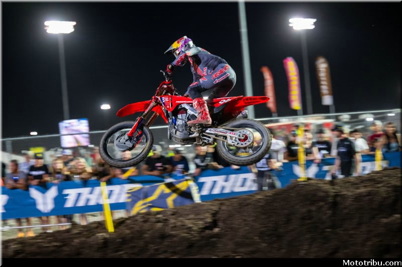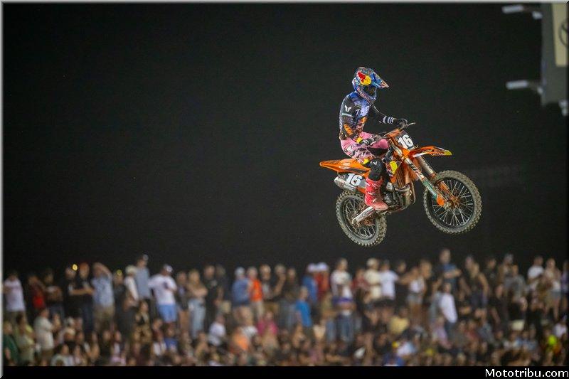 450 – Clap de fin sur la saison de cross US avec cette finale de Las Vegas qui vient décerner une sorte de titre de champions des champions, histoire de faire un peu d’ombre au WSX mondial. C’est donc Jett Lawrence qui s’est imposé confirmant sa bonne condition physique après son abandon de la saison outdoor et sa première victoire lors des playoff de Charlotte. Jett empoche la coquette somme d’1 million de dollars. Son frère Hunter second se contentera de 500 000 et Eli Tomac 3ème de 250 000. De quoi partir en vacance serein pour les trois hommes. Chase Sexton éreinté par sa saison et son titre outdoor a préféré jeter l’éponge dès le début de la première manche. Dylan Ferrandis se classe 13ème.