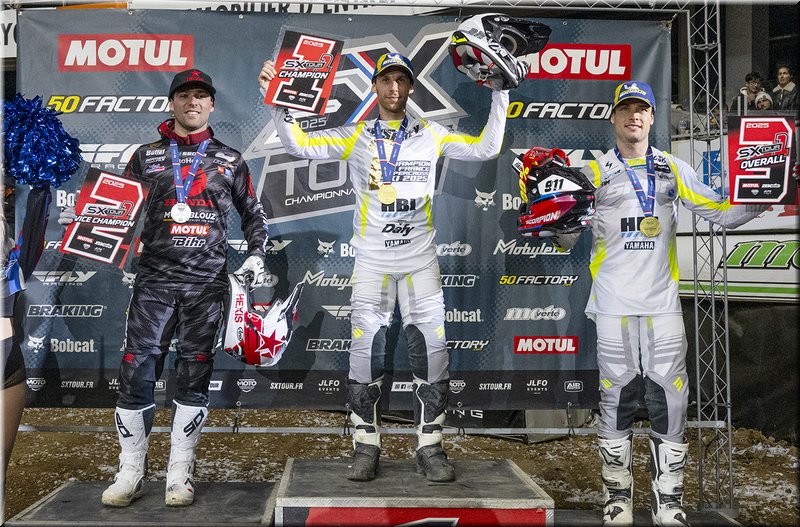 Classement Final SX1 : 1er Maxime DESPREY – Yamaha GSM Dafy 98pts, 2 Anthony BOURDON – Honda SR 77pts, 3ème Jordi TIXIER – Yamaha GSM Dafy 73pts, 4ème Jorge ZARAGOZA – Stark Future 71pts, 5ème Lucas IMBERT – Honda 61pts, 6ème Charles LEFRANCOIS – Honda 54pts, 7ème Greg ARANDA – Yamaha GSM Dafy 53pts, 8ème Cédric SOUBEYRAS – Honda 46pts, 9ème 8ème Yannis IRSUTI – Stark Future 46pts, 10ème Adrien MALAVAL – Yamaha 44pts