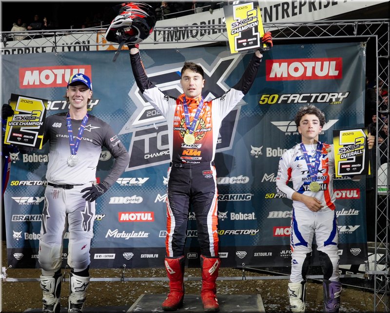 Classement Final SX2 : 1er Calvin FONVIEILLE – KTM TMX 143pts, 2ème Michaël HICKS – Stark Future 137pts, 3ème Jules PIETRE – Yamaha TMX 107pts, 4ème Saad SOULIMANI – TM 105pts, 5ème Hugo MANZATTO – Husqvarna 91pts, 6ème Mickaël LAMARQUE – KTM 89pts, 7ème Kelena HUMPHREY – Stark Future 82pts, 8ème Andrea BONIFACIO – Husqvarna 75pts, 9ème Dorian KOCH – KTM 68pts, 10ème Mathys BOISRAME – 737 Performance KTM 42pts