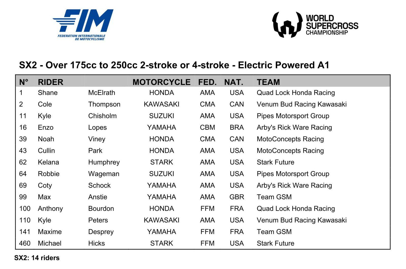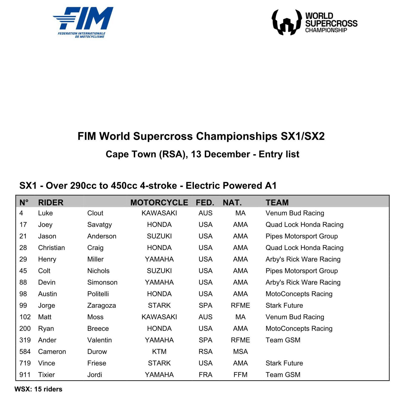 MX - SX MX SX 2025 Sport Terre Supercross Supercross 2025 Supercross 2025 - WSX 5. Afrique du Sud SUPERCROSS – WSX, Afrique du Sud, Cape Town, la liste des pilotes 11 décembre 2025 Adrien 5673 Vues La liste des pilotes de la dernière manche du WSX avec Jordi Tixier comme seul représentant tricolore annoncé en SX1 et toujours Maxime Desprey et Anthony Bourdon en SX2. La liste des pilotes Abonnez-vous à la newsletter Mototribu Veuillez laisser ce champ vide Merci pour votre abonnement