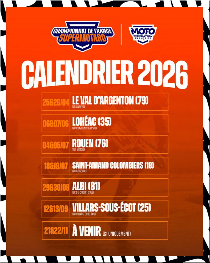 FFM Sport Vitesse Supermotard Supermotard 2026 SUPERMOTARD – le calendrier du championnat de France 2026 28 novembre 2025 Adrien 5304 Vues Le calendrier du championnat de France 2026 de Supermotard. Abonnez-vous à la newsletter Mototribu Veuillez laisser ce champ vide Merci pour votre abonnement