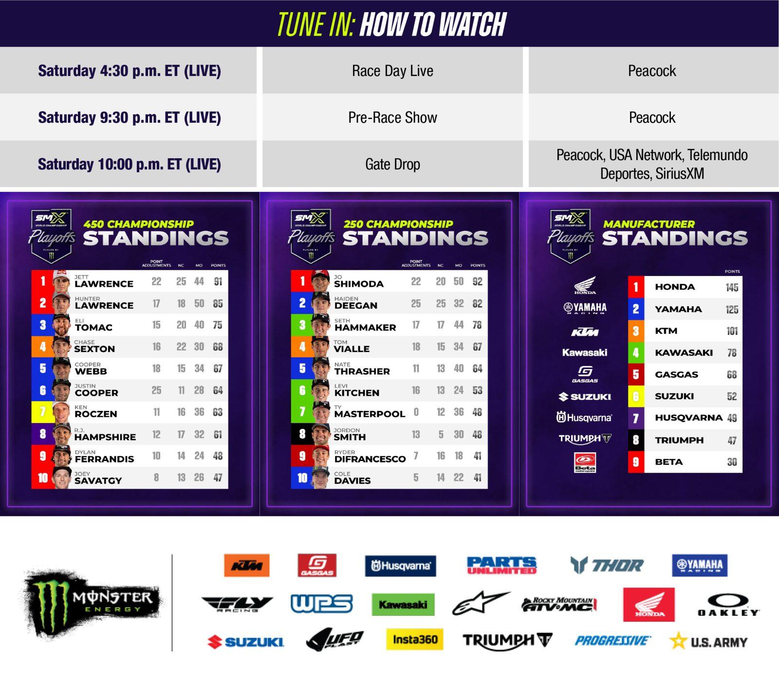 Avec 75 points à distribuer cette finale de Las Vegas compte triple dans les deux catégories. Les pilotes vont disputer 2 manches de 20mn + 1 tour. Au final le vainqueur empochera la coquette somme de 1 million de dollas en 450 et 500 000 en 250. Il faut noter que la catégorie 450 récompensera le 22ème d’une sacrée somme de 25 000 dollars contrairement au 22ème en 250 qui ne touchera que 2000 dollars.